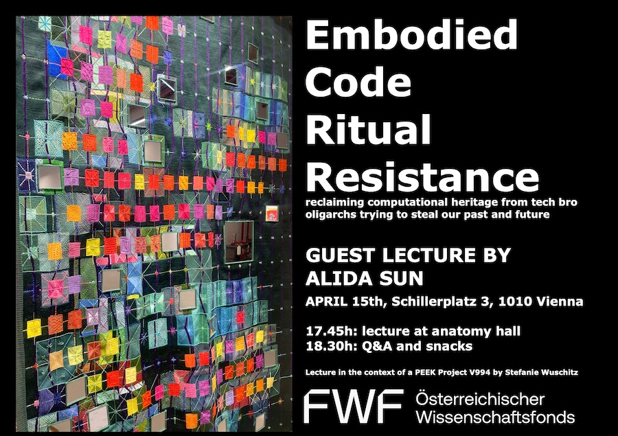 Alida Sun will explore play as research methodology, data as material for somatic inquiry, and reclaiming computational heritage from tech bro oligarchs trying to steal our past and future.
